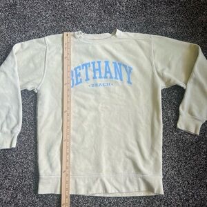 Soft cream sweater with blue 'Bethany Beach' print. Ideal for relaxed style. 80% cotton, 20% polyester