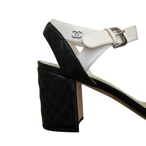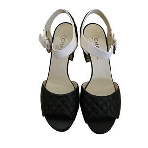 Chanel quilted block heel sandals, Chanel navy cream two tone heels, Chanel CC logo ankle strap heels, classic Chanel leather sandals, Karl Lagerfeld era Chanel shoes