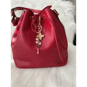 The Louis Vuitton Red EPI Leather Neo Noe Drawstring Shoulder Bag in medium size is a stylish and versatile accessory designed for various occasions such as travel, weddings, parties, casual outings, formal events, workwear, and business meetings. Made from red leather with a solid pattern and Louis Vuitton Epi finish, this shoulder bag features a drawstring closure, adjustable shoulder strap, and brass hardware. The bag also comes with a detachable strap and a colorful bag charm, making it a practical and fashionable choice for everyday use.