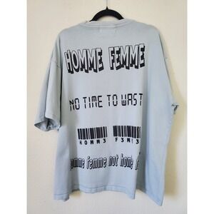 Short-sleeve crewneck tee features a multi-logo graphic print on both the front and back, including barcode and script typography. Crafted from a heavy 100% cotton jersey in a light blue shade, it offers a relaxed, oversized fit typical of streetwear aesthetics. The back includes the phrases "NO TIME TO WAST" and "homme femme not home f" for a distinct, deconstructed look. **Note some small dark spots on the upper shoulder as shown in photos.