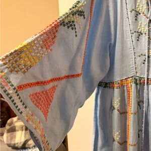 Elegant light blue maxi dress with intricate embroidery. Features colorful fruit and floral designs. Perfect for a vibrant look.