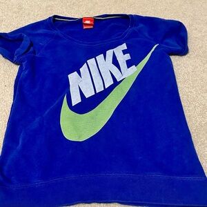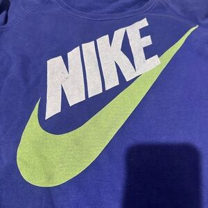 Comfortable Nike sweatshirt tee. Features a bold lime green Nike logo on a purple background. Gently used