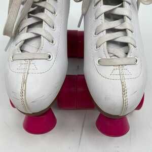These White Pink roller skates from Chicago Skates pair classic style with everyday practicality. Built with a sturdy polyurethane base and textile accents, they glide smoothly across winter, spring, summer, and fall outings. Scuffs on the toes and minor wheel wear are reflected in the product photos, but the overall ride remains reliable for casual skating or light recreation. Wear them with jeans or athleisure for a playful, retro-inspired look that’s ready for any day on the go.