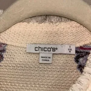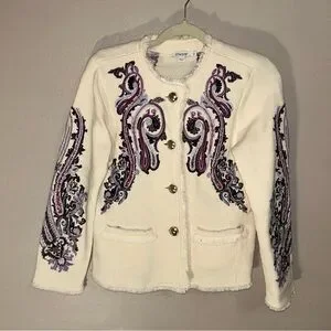 Chico's blazer with elegant purple embroidery. Stylish and chic design.