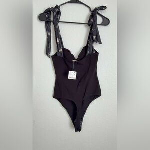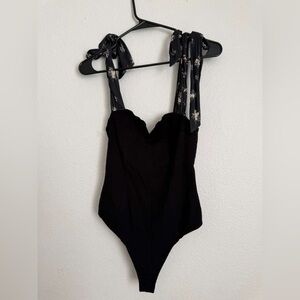Free People Black Bodysuit with Floral Tie Straps
