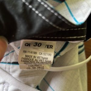 Size 30. Husband bought these and just never wears them. White/gray color with blue plaid. Netting still attached. Pocket on the side