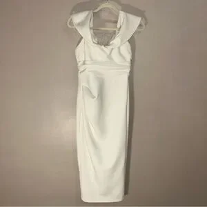 This chic off-shoulder dress is ideal for weddings and special occasions. The timeless white color enhances its elegant design.