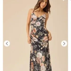 Chic black maxi dress with black with pink peach gold and cream floral design. Gorgeous. And silver straps. Ideal for elegant outings.