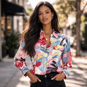 Brighten your wardrobe with this vibrant floral print top. Perfect for any occasion, this top features a mix of red, blue, and pink hues.