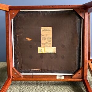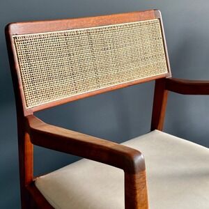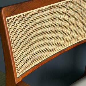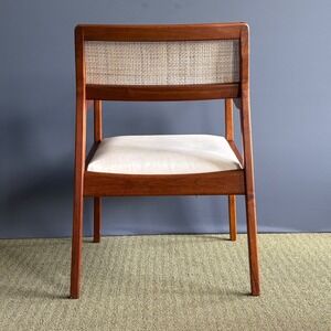 Frames are solid walnut with a rich, warm tone and attractive grain throughout. Structure is tight and sturdy. The cane backs appear recently professionally restored, and are taut and structurally sound with only a few minor imperfections, as shown. Upholstery is original and in near-mint vintage condition, showing very light wear consistent with minimal use.