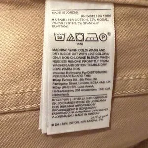 • Belt loops, button closure, and zip fly