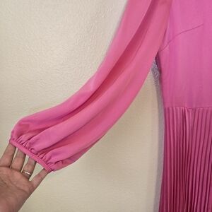 Stunning pink long maxi dress with plated skirt and long sleeves.