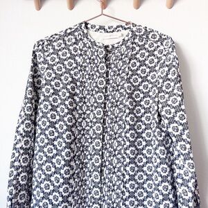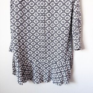 Long sleeve shirt dress with all over pattern. Fabric covered buttons and flounce hem. In good condition with no visible flaws