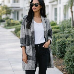 Stay cozy and stylish with this elegant colorblocked shawl jacket. Perfect for layering and adding a touch of sophistication to any outfit.