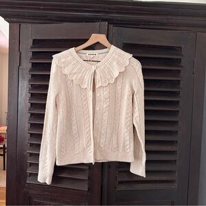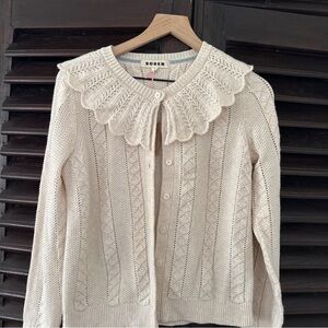 Chic cream cardigan by Boden. Features a delicate scalloped collar. Perfect for layering.