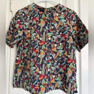 Terry Lewis Classic Luxuries linen blend top with a cute colorful bird pattern, size S. Pullover style with a single button closure in the back. Great condition with no flaws. Smoke free. No holes or stains.