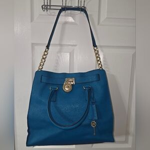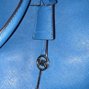 Stylish Michael Kors shoulder bag in vibrant turqouis blue. Features elegant gold hardware. Perfect for everyday use. Coming from a smoke-free and pet free home. One small blemish on the inside (see photo). This bag has developed a lovely slouchy silhouette, perfect for a casual look. The leather has developed it's relaxed look due to being stored away.