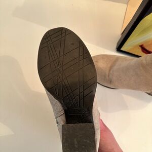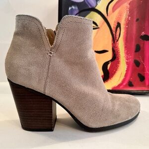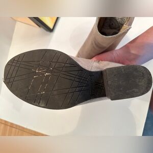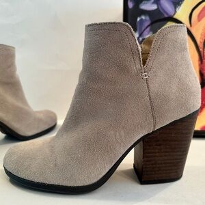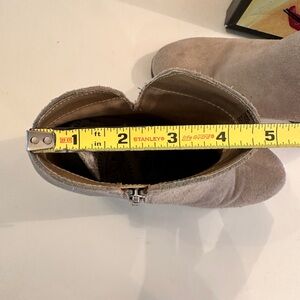 Real suede and wood heel booties.Tan boots with dark brown heel. Heel height shown. I used to LOVE these. Inside I had put two cushion inserts, which you'll see in the pictures.