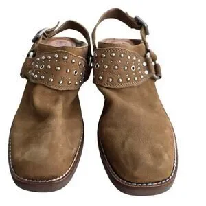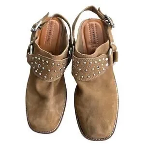 Lucky Brand Kalv Studded Leather Mules in Dark Natural. Size 7.5M. Features square toe, stacked block heels, nubuck leather upper, harness and studded accents, cushioned insole, and adjustable buckle slingback strap closure. Has signs of wear on uppers.