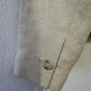 Brown linen blend (67% Linen, 33% Cotton). Blazer. Long sleeves. Front button closure. 23" from shoulder to hemline. Imported.