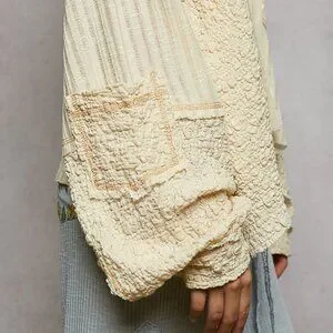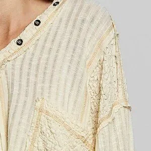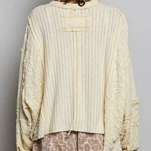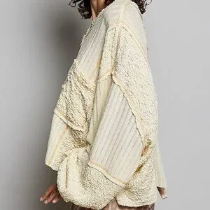 This top is designed with a V-neck, balloon sleeves, and a roomy fit for a chic and relaxed style. The ribbed fabric features stitch detailing and a pointed solid pattern for added texture and interest. The non-functional button detail lends a touch of sophistication and charm to the top. Perfect for achieving a trendy and effortless look with its combination of stylish elements. A versatile piece that can be dressed up or down for various occasions.