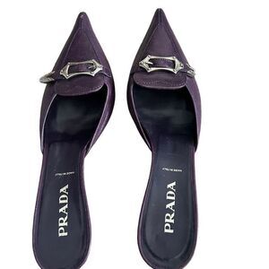 Prada Royal Purple Buckle Kitten Heel Mules.