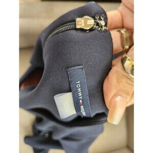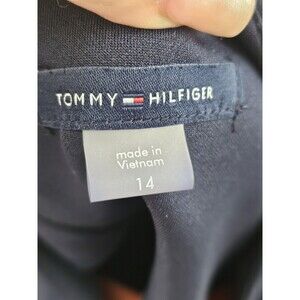 The product is a Tommy Hilfiger navy shift dress with bell sleeves and gold button detail. This preppy size 14 dress is designed for women and features a stylish shift silhouette with a feminine bell sleeve design. The dress is a classic blue color with a button closure, making it a versatile and chic addition to any wardrobe.