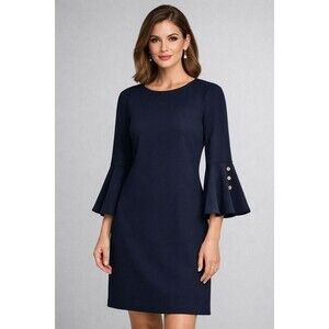 Tommy Hilfiger Navy Shift Dress Bell Sleeves Gold Button Detail Preppy Size 14.