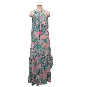 Lilly Pulitzer sleeveless maxi dress featuring a vibrant multicolor tropical print in shades of pink, green, and blue. Halter neckline with button-front detail and tassel tie accent. Flowy, relaxed silhouette with tiered ruffle hem for a breezy, feminine look. Lightweight fabric — perfect for spring, summer, vacation, or resort wear.
