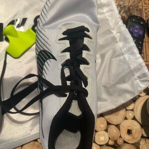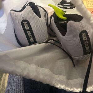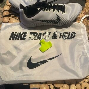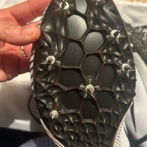 Sleek track spikes with a lightweight design. Features a pure platinum upper and black accents. Perfect for competitive running. Slight wear, good condition