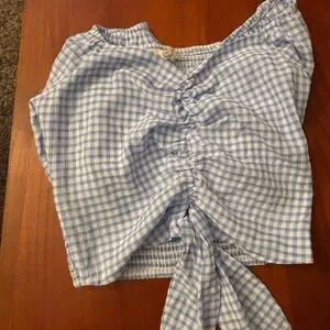 Chic blue gingham crop top with adjustable bow tie front detail. Perfect for casual outings.