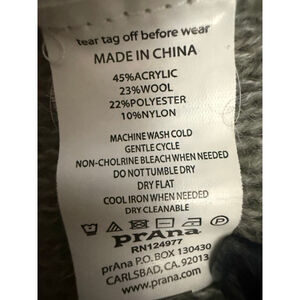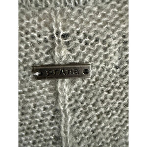 This is a pre-owned women's prAna gray cable knit poncho sweater, size M. It features a V-neck with adjustable drawstring ties and a mix of cable knit patterns and bobble details on the front. The bottom hem is adorned with fringe. The back is a plain knit with a vertical seam and a small metal prAna tag. The care tag indicates a blend of 45% acrylic, 23% wool, 22% polyester, and 10% nylon, with machine wash cold instructions. The sweater appears to be in good condition with no significant visible imperfections… EXCELLENT CONDITION.