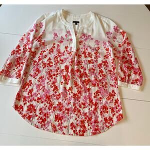 Talbots Popover Blouse Top Sz M Floral Split Neck 3/4 Sleeves Pink Red Cream