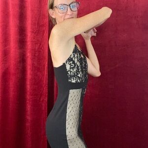 Chic lace chemise with delicate straps. Features intricate black lace over cream fabric. Ideal for intimate settings.