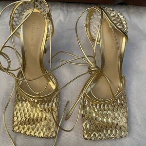 Elegant gold heels with intricate strap design. Perfect for adding a touch of luxury.