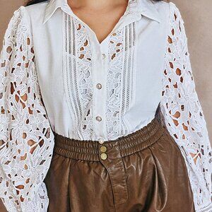 White Elegant Women's Lace Patchwork Ruffle Trim Front Button Long Sleeve Blouse