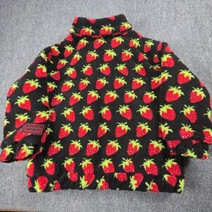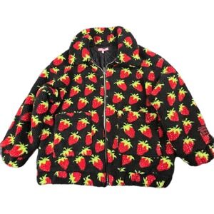 Dolls Kill x Strawberry Shortcake limited edition True Convectiond Teddy sherpa jacket. Rare, sold-out collaboration featuring an allover strawberry print on plush teddy fleece with a fully quilted lining for warmth and structure. Oversized, heavyweight fit with full zip front and front pockets. Cozy, statement outerwear with strong nostalgia and collectible appeal.