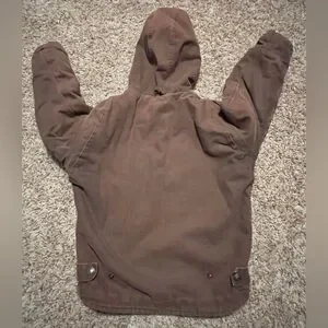Keep your child warm and cozy with this chocolate brown hooded utility jacket. Perfect for outside play, chores, or excursions in the woods!