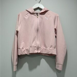 Stylish pink bomber jacket by Puma. Features a front zipper and hood. Perfect for casual wear.