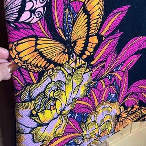 Bright, vibrant midi skirt with butterfly and floral patterns. Stretchy with side zipper. High waisted, fully lined. Has some signs of wash wear, but condition is great! Made in Indonesia.