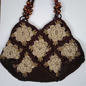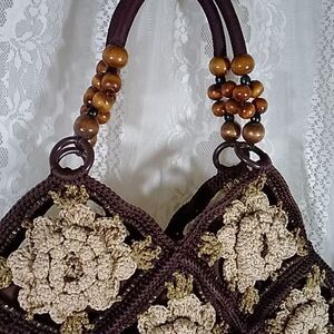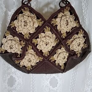 VTG, Crochet Style Retro Handmade Floral Handbag And Shoulder Bag Brown And Gold
