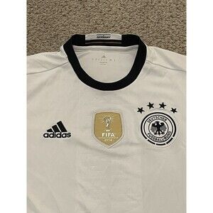 The product is a men's size M Adidas Germany National Team soccer football jersey. This officially licensed shirt features short sleeves, a white main color, and is suitable for adults. The jersey is designed specifically for fans of the German national team, making it a great choice for supporters of the team during events like the FIFA World Cup. Made by adidas, this shirt represents the German national team in the sport of football, showcasing team pride and allegiance.