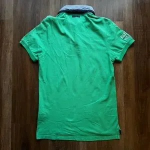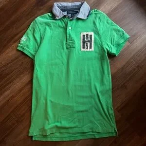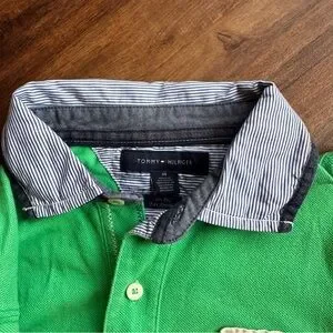 π Classic Tommy Hilfiger green rugby-style polo with embroidered patch and striped collar. Timeless preppy essential.