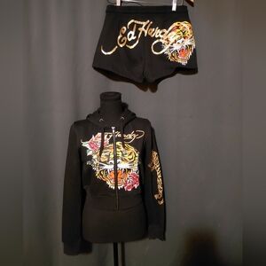 Ed Hardy Black Tiger Y2K Style Hoodie & Shorts Sweatsuit Set Size Medium Brand New With Tags.
