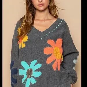 Chic V-neck sweater by POL. Features bold floral patterns in vibrant colors. Perfect for a stylish look.