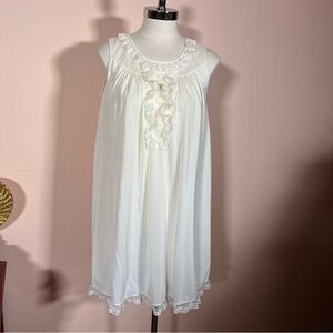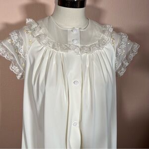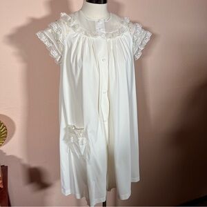 Get romantic with this retro Peignoir set with a retro fairy core style. A babydoll fit with a generous A-Line cut with a slip chemise nightie with smocking top detail with tiny fairy like accents of lace, flowers and ribbons. Sweet flutter lace sleeves with a covered button front in elegant robe. Sweet short length flirty around the knees. Crazy off white color with a pastel palest pink and yellow embroidery. Perfect and charming set
