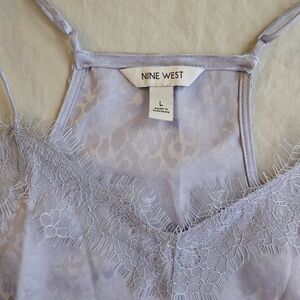 Very 90s Y2K style racerback blouse from Nine West - racerback with adjustable spaghetti straps, lace detail at vneck, and leopard/embossed cheetah pattern on the shiny pastel lavender fabric.