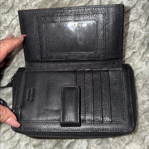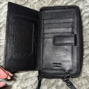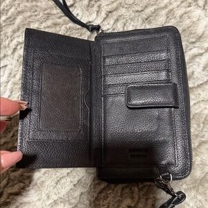 Stylish leopard print wallet with black accents. Features a secure zipper closure and wrist strap.