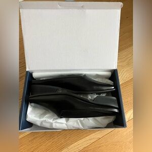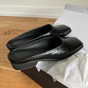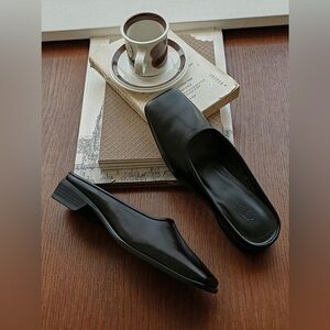 black leather, square toe, pointed mules, cowhide, minimalist, sleek, formal footwear, chic, modern, flat shoes