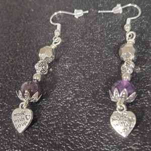 These elegant silver earrings are handmade by me. They feature a natural 8mm purple amethyst bead and silver heart charm with 'made with love' engraved on it. The earrings are about 2-1/4" in length and have silver spacers. The silver earring hooks are hypoallergenic and come with plastic earring backings. The silver heart charm is about 1/2" long. Perfect for adding a touch of sophistication to any outfit.